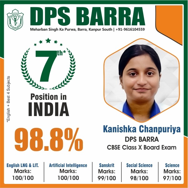 Congratulations to Kanishka Chanpuriya of DPS BARRA for securing 98.8% and 7TH POSITION in INDIA in CBSE Class X Board Exam 2026